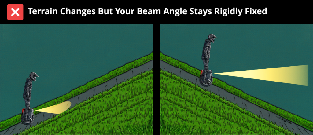 Climb a hill and your light aims at the ground directly beneath you. Descend and it shoots skyward while the road disappears into shadow. Fixed-mounted headlights can’t adapt to terrain changes.