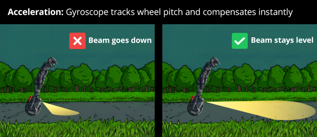 Gyroscope tracks the wheel’s pitch angle in real-time, compensating instantly to keep the beam level during acceleration and braking. This eliminates the tilting headlight problem – your light stays pointed at the road ahead, not diving to the ground or shooting skyward.