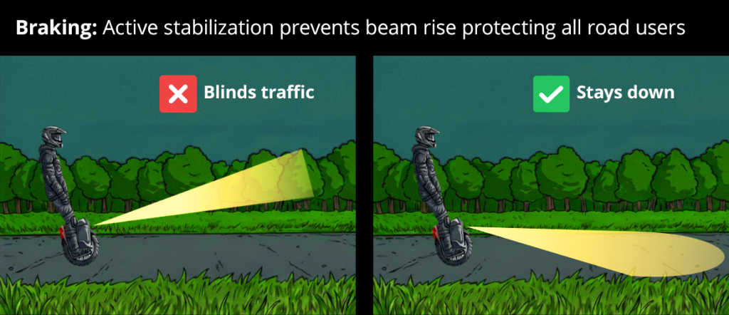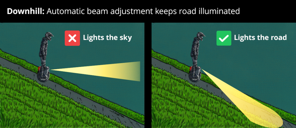Speed up and your light dives to the ground – exactly when you need to see ahead. Slow down and it shoots up, blinding oncoming riders. Stock headlights follow wheel pitch, creating visibility problems with every speed change.