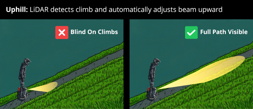 Lidar measures ground distance continuously, automatically adjusting beam angle on climbs and descents. When you hit an uphill, the lidar detects the changing distance and tilts the beam up to keep illuminating your path. On downhills, it adjusts the beam down.